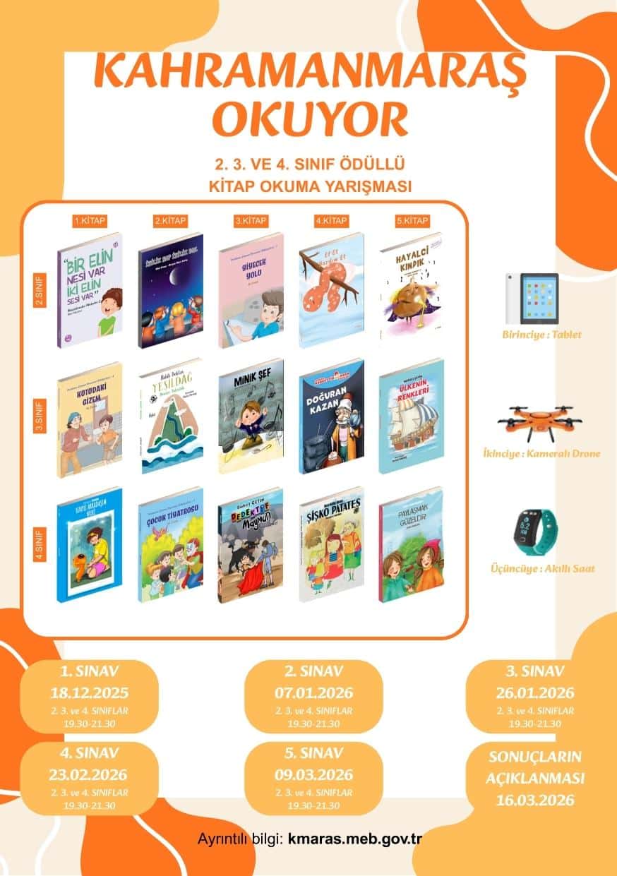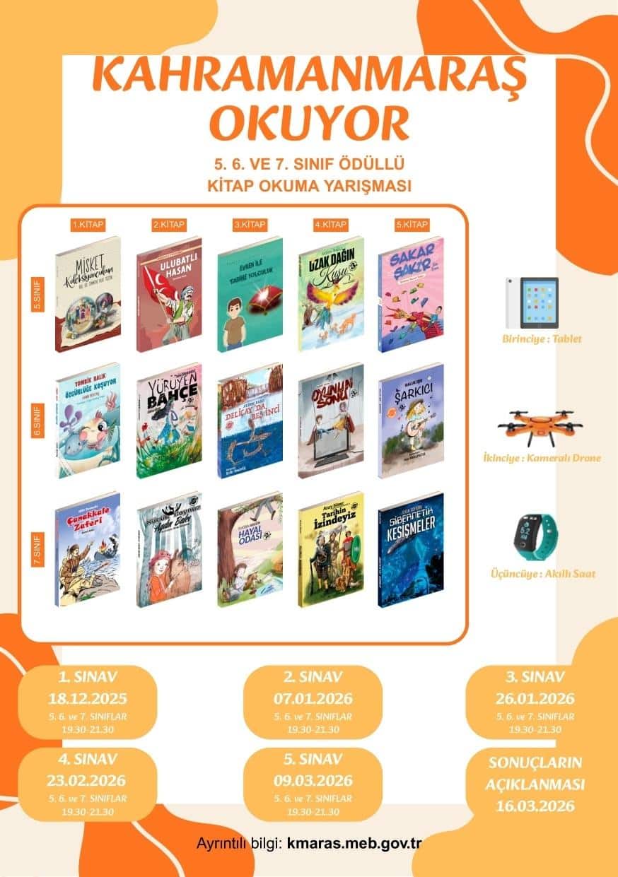 Kahramanmaraş İl Millî Eğitim Müdürlüğü tarafından yürütülmekte olan "Kahramanmaraş Okuyor" Projesi kapsamında, öğrencilerimizin okuma alışkanlıklarını geliştirmek, okuduklarını anlama, yorumlama ve eleştirel düşünme becerilerini artırmak amacıyla il genelinde bir yarışma düzenlenmektedir.